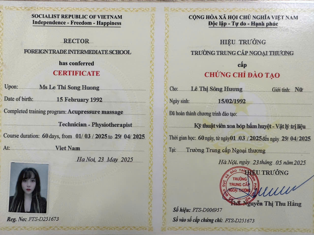 Không chỉ tập trung vào việc giảm đau tức thời, chị Hương còn hướng đến trị liệu bền vững, giúp khách hàng cảm nhận sự nhẹ nhõm, dễ chịu và cải thiện rõ rệt sau mỗi buổi trải nghiệm. Phong cách làm việc nhẹ nhàng, chuyên nghiệp cùng sự tận tâm trong từng liệu trình chính là lý do khiến nhiều khách hàng lựa chọn và quay lại trị liệu cùng chị Lê Thị Sông Hương.